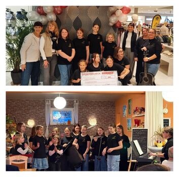 Zuerst feierten sie beim Geburtstag des Kaufhauses Schwager – acht fröhliche Songs, eine halbe Stunde voller Applaus und als Krönung eine großzügige Spende von 500 €! 🎁